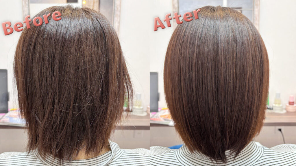 いわゆる髪質改善の一種なんですが、通常の髪質改善のように繰り返しすぎると髪が硬くなるといったデメリットがなく、都度きれいになっていきます。