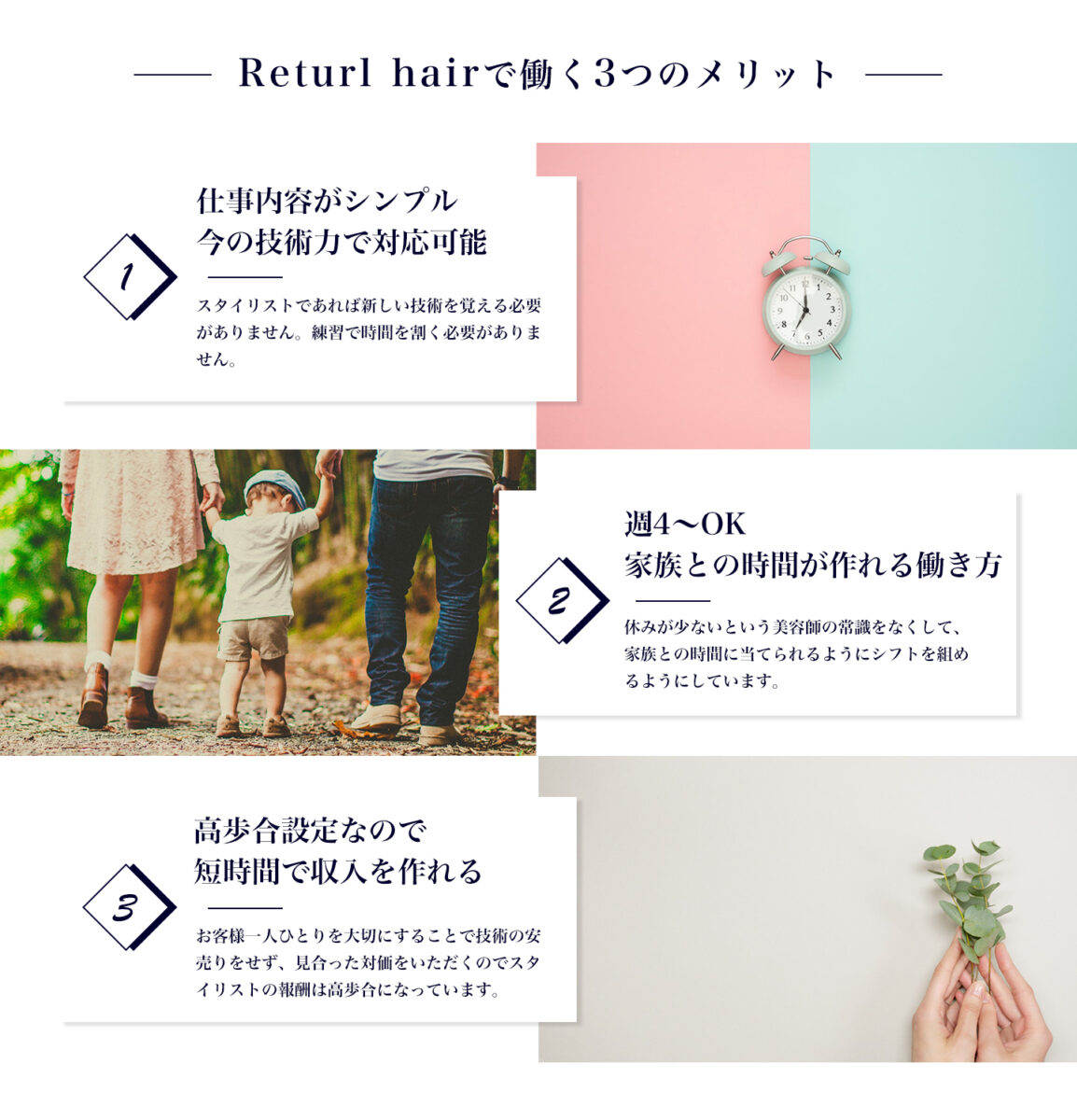 美容師として働いていても自分のプライベートな時間を大切にでき、必要な収入を得ることができるよう会社として取り組みます。