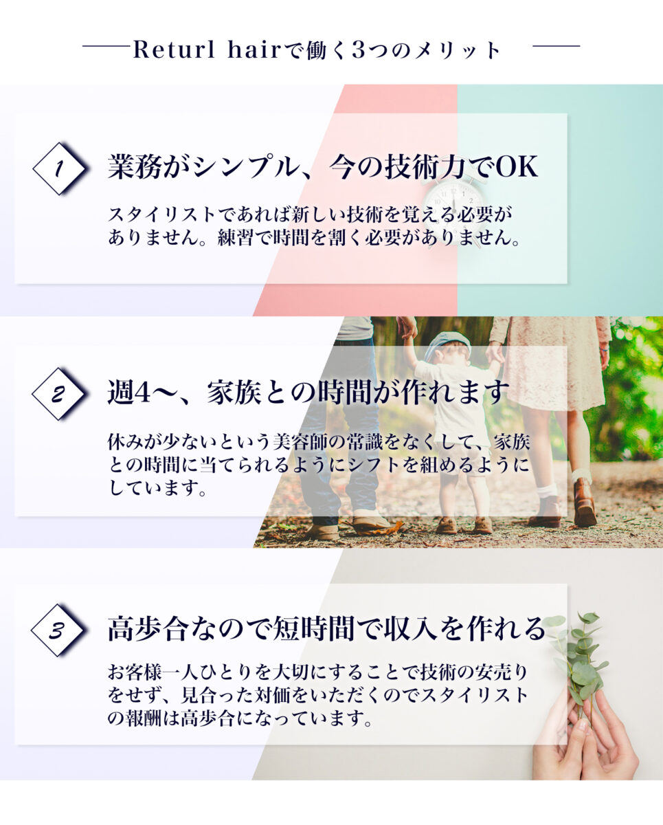 妊娠・出産・育児というイベントで美容師から遠ざかってしまった方でも、働き方を選びやすく・そして稼ぎやすい環境を作ることで自分の時間を大切にしてもらいたく立ち上げます。